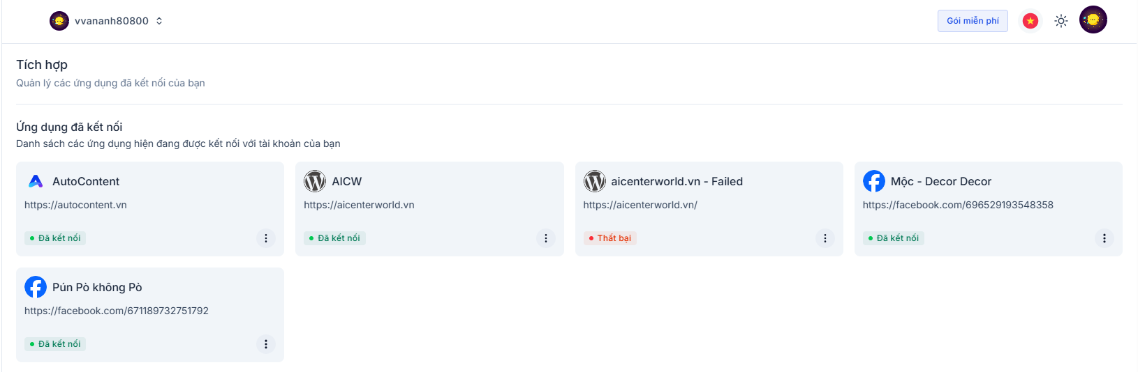 Tính năng Tích hợp cho phép bạn kết nối các nền tảng như Facebook Page, WordPress, Umbraco... giúp đăng bài, quản lý nội dung đồng bộ và tự động từ một nơi duy nhất trên AutoContent. Nhờ đó, bạn tiết kiệm thời gian và tối ưu hoá quy trình phát hành nội dung đa kênh.