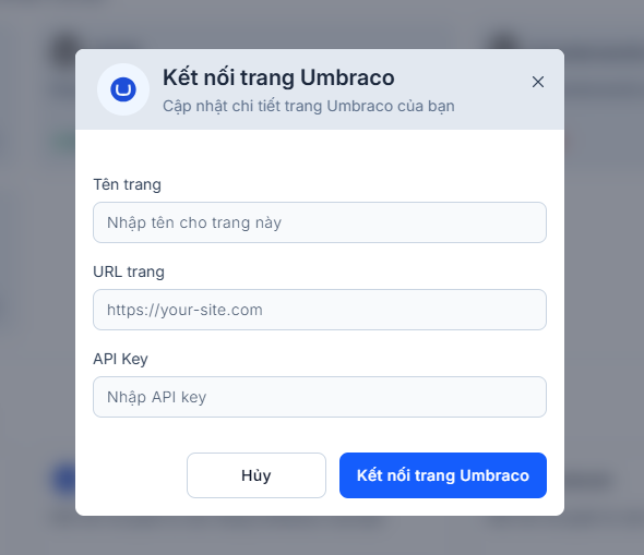 Popup nhập thông tin kết nối Umbraco site qua API Key.