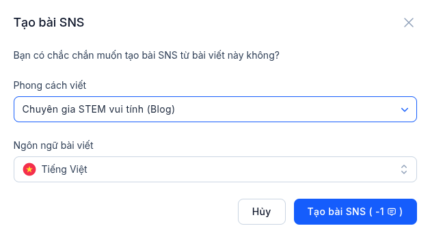 Sau khi chọn giọng văn và ngôn ngữ, hệ thống AI sẽ tự động viết một bài SNS từ bài Blog đã có sẵn. Sau đó bạn sẽ được chuyển qua màn hình soạn thảo SNS để chỉnh sửa và đăng bài.