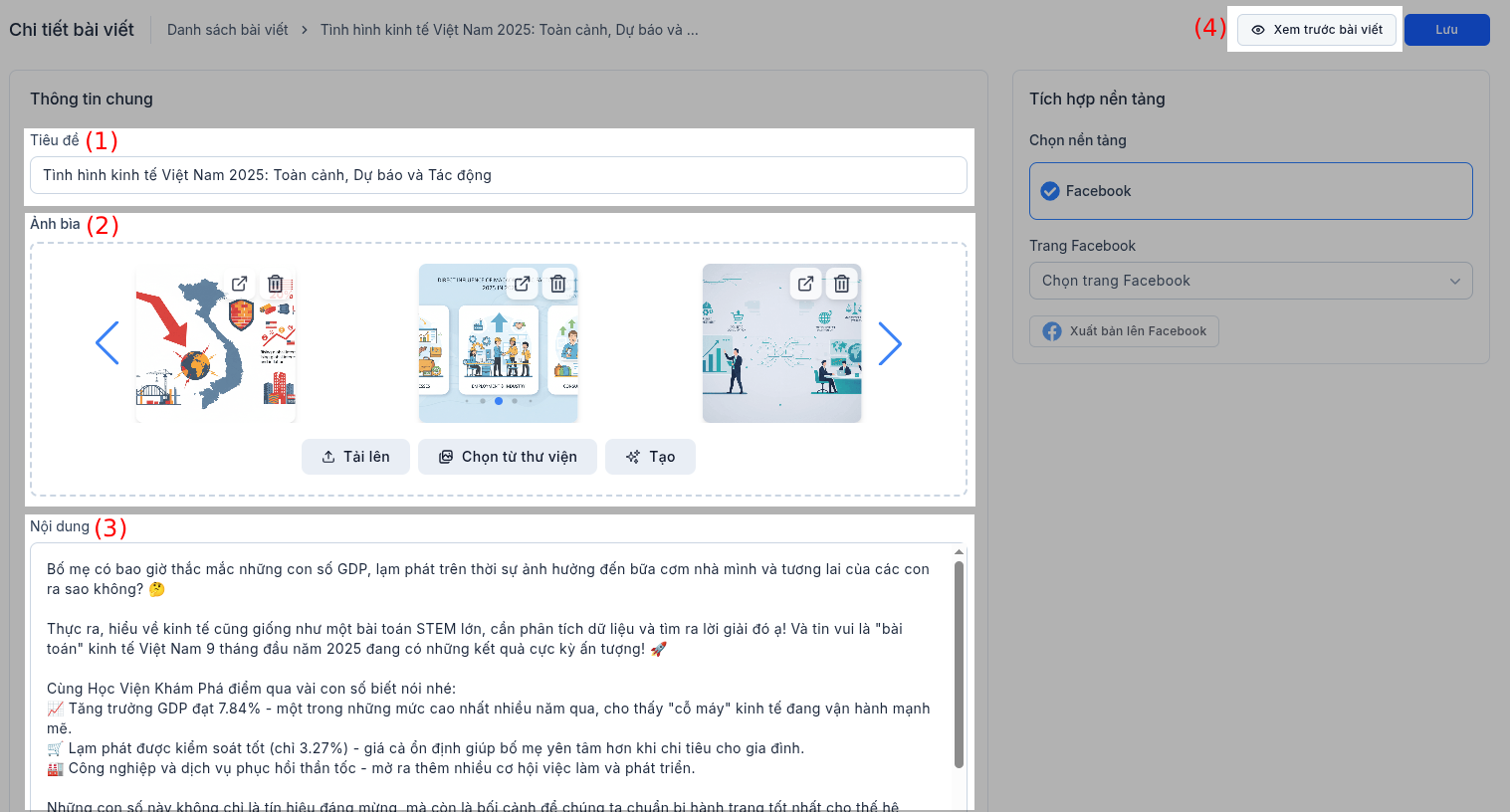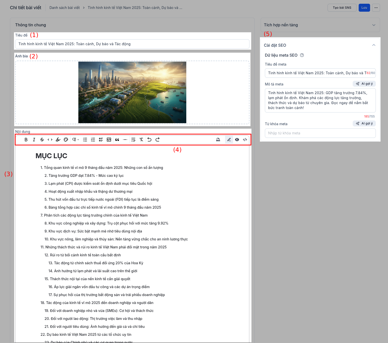 Nội dung (3): Vùng soạn thảo chính. Bạn có thể gõ trực tiếp, dán nội dung từ Word/Google Docs, hoặc dùng nội dung đã tạo từ tác vụ. Khu vực này hiển thị toàn bộ bài viết để chỉnh sửa.