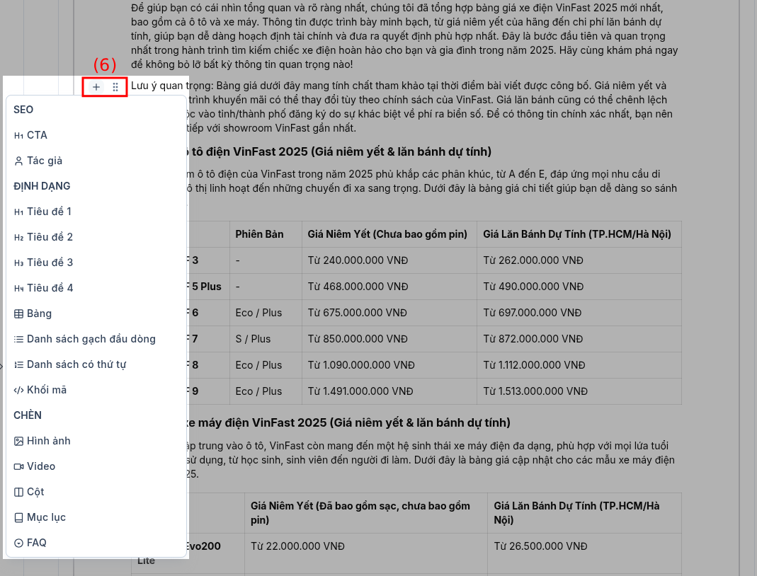 CTA: Khối kêu gọi hành động nổi bật, giúp thu hút độc giả tương tác. Bạn có thể tạo các CTA từ màn hình quản lý CTA, xem Hướng dẫn tạo CTA.