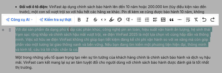 Thanh công cụ soạn thảo di động: Khi bạn bôi đen một đoạn văn bản, bạn sẽ thấy thanh công cụ soạn thảo di động xuất hiện: