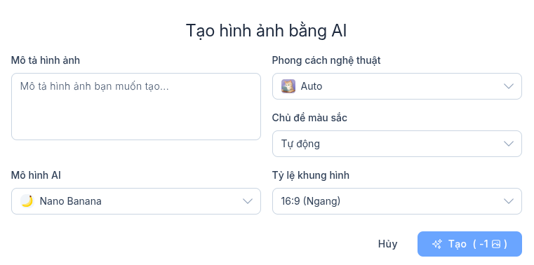 - Mô hình AI: Chọn model tạo ảnh phù hợp nhu cầu chất lượng/tốc độ.