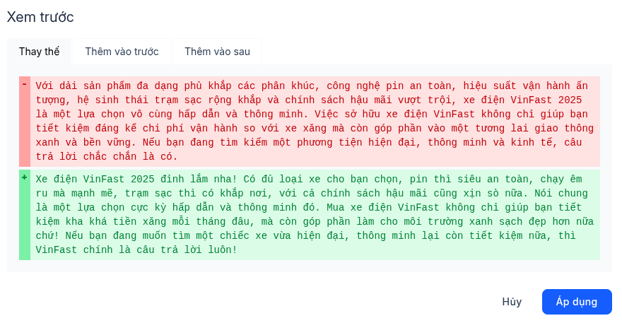 Sau khi chọn 1 công cụ và chạy, hệ thống sẽ hiển thị hộp thoại để bạn có thể kiểm tra kết quả và chọn thay thế/thêm vào trước/sau đoạn đang chọn: