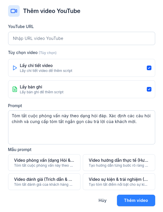 - Prompt: Nhập yêu cầu tóm tắt/phân tích video theo ý bạn.