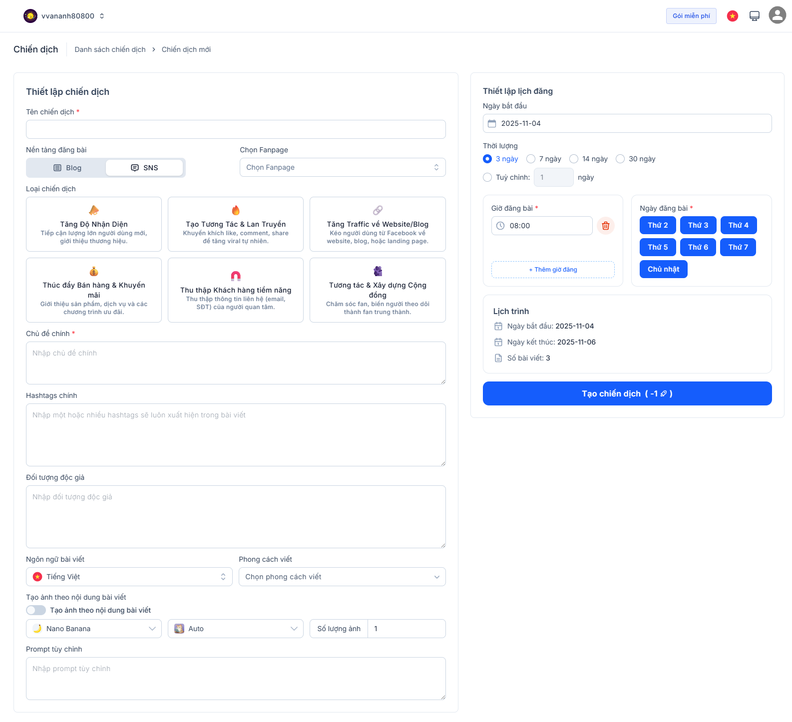 Kiểm tra Lịch trình và nhấn Tạo chiến dịch để hệ thống tạo bài và lên lịch tự động.
